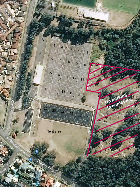 Teams can set up their tents at the southern end of the court precinct, on the grassy area between the upper courts and Dudley Road. No tents in the cemetery area. Teams can start setting up tents from 7:30am onwards.